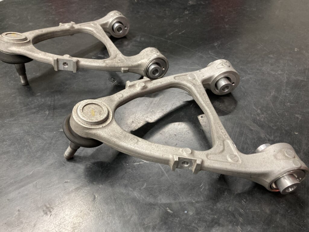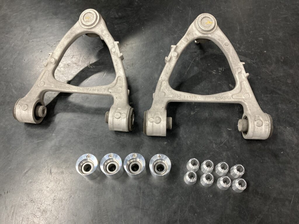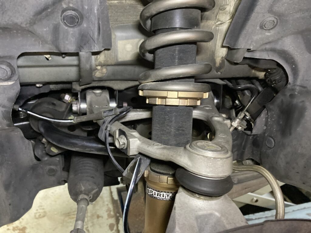 まずはアライメント数値の適正化のため、アッパーアームブッシュを偏心ピロボールに打ち換えて強制的にキャンバー角を増やします。