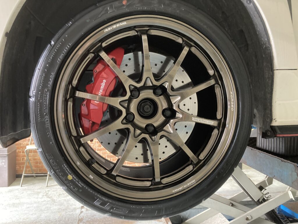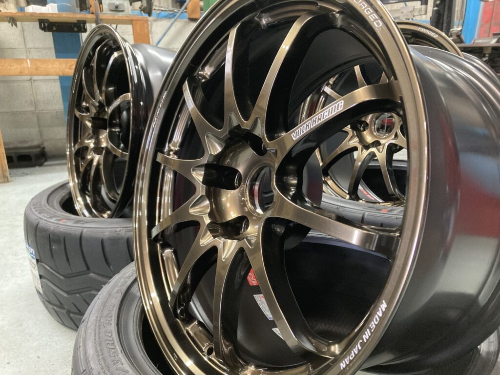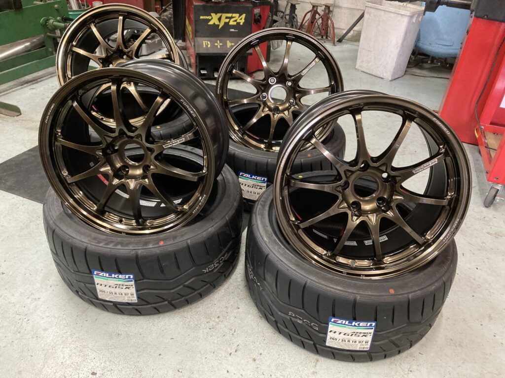 タイヤはグリップ力・癖のない扱いやすさ・価格のバランスがいいファルケンRT615K+、ホイールは買い替えることがないので、RAYSのCE28N-PLUSで非常に評判の良いシャイニングブロンズメタルカラーです。