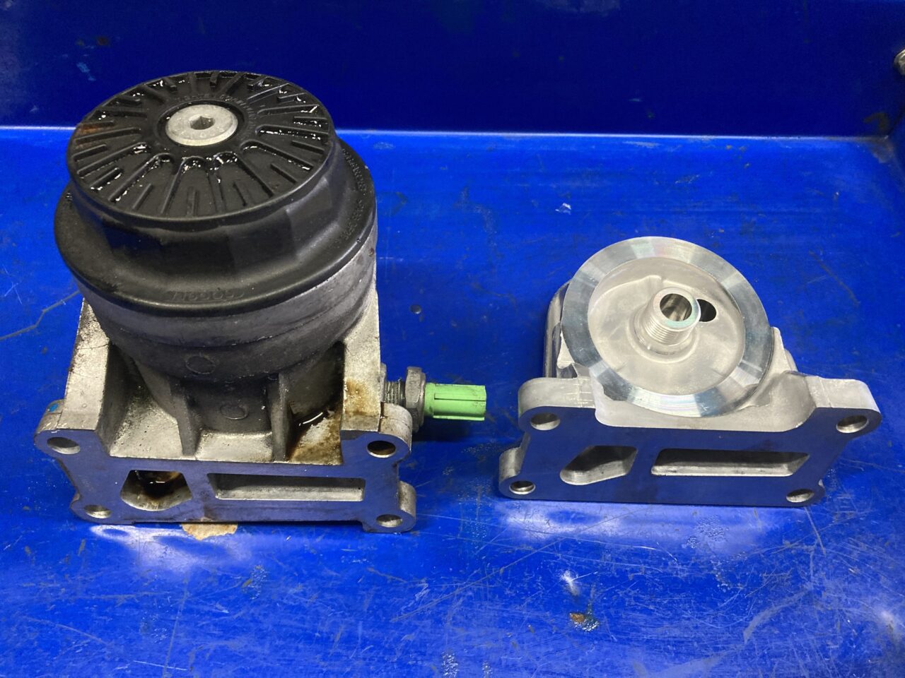 アクセラのオイルエレメントはカートリッジ式でそのままではオイルクーラーのサンドイッチブロックが装着できないのでNCロードスター用のオイルブロックに変更して取り付けます。