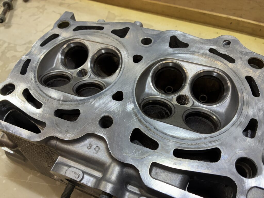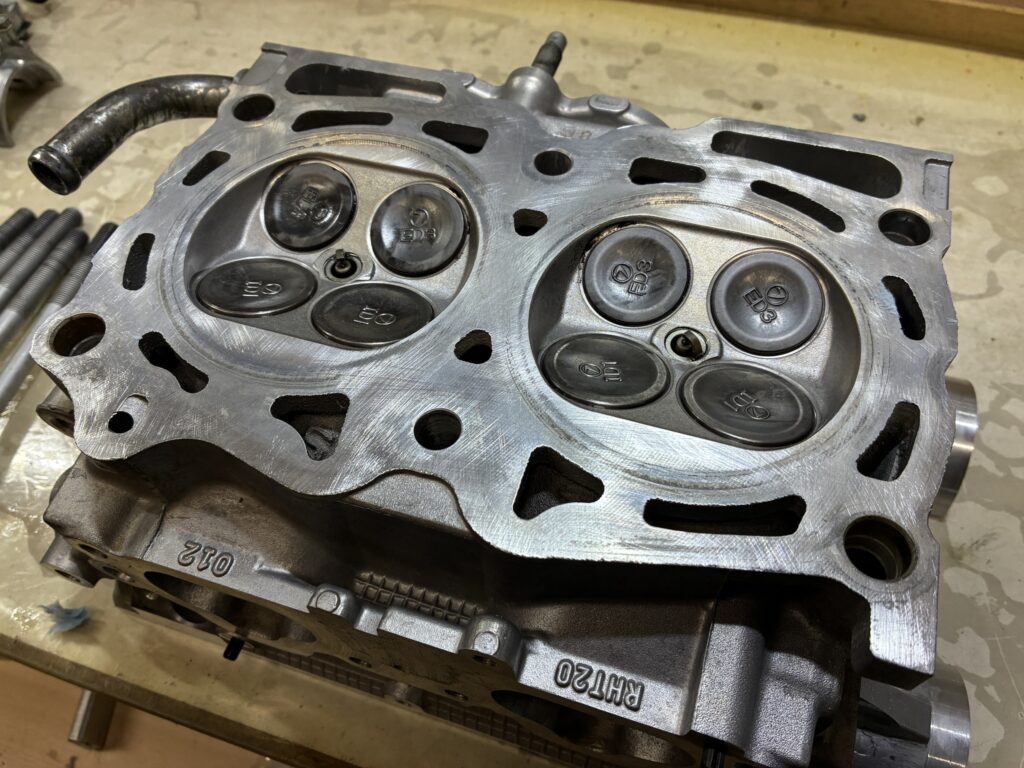 バルブの曲がってしまったインプレッサのEJ20エンジンですが、バルブシートにまでダメージがいっていたので加工屋さんでバルブシートカットをしてもらい組み付け直し。