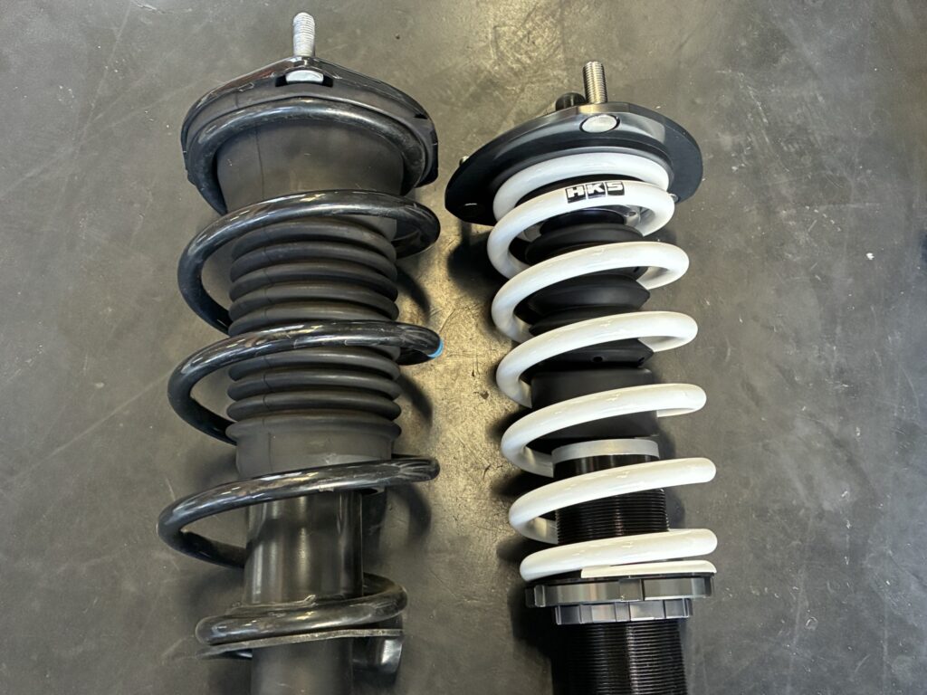 今回のHKSハイパーマックスSは問題のスプリングを通常の直巻きでなく全長は長く径も太い樽型スプリングにすることで直巻きとは違う純正スプリングのような特性となり問題を解決しているようです。