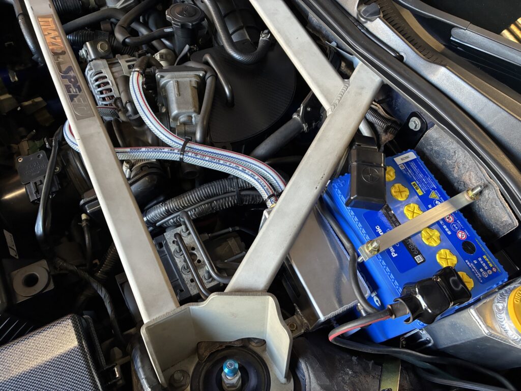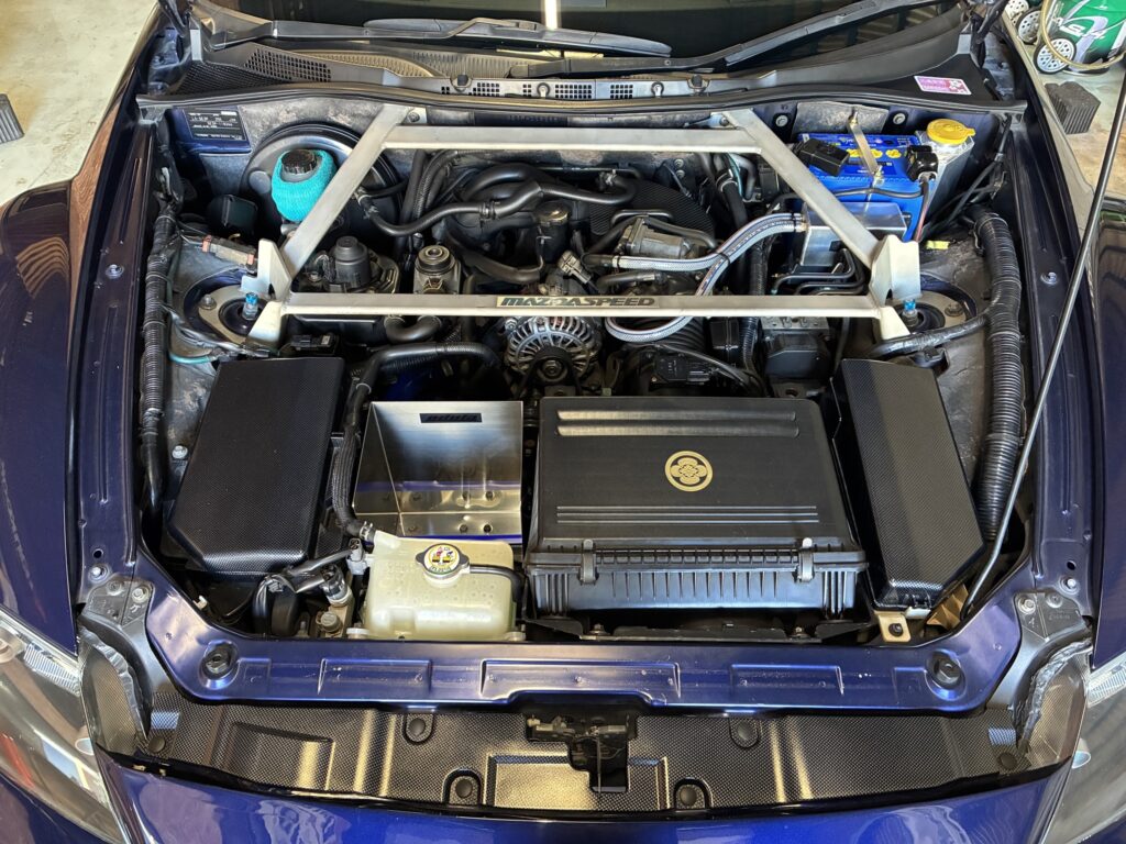 しかしながら、前回装着したバッテリー移設キットとマツダスピード製タワーバーの組み合わせはメンテナンス性が最悪で、オイルエレメント脱着やレベルゲージの抜き差しは火傷覚悟の作業となります(悲