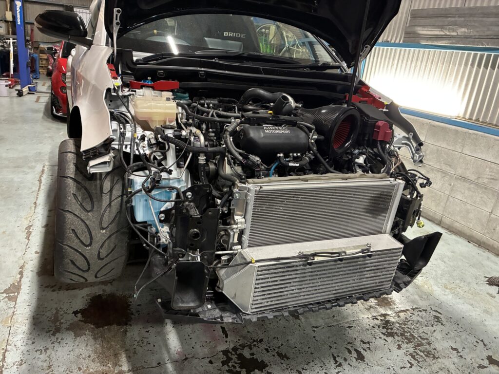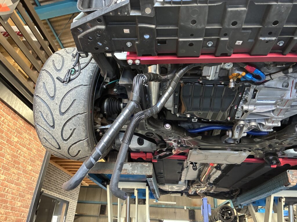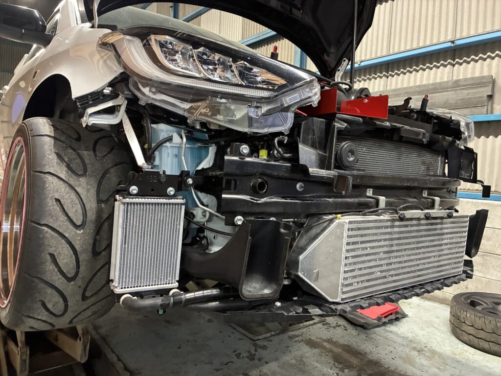 ヤリス用とはいえバンパーは違う形状でオイルクーラー配管もあり、そしてワイド化ボディに合わせたオフセットのタイヤ・ホイールとのクリアランスなど、色々確認しながらワンオフ装着。