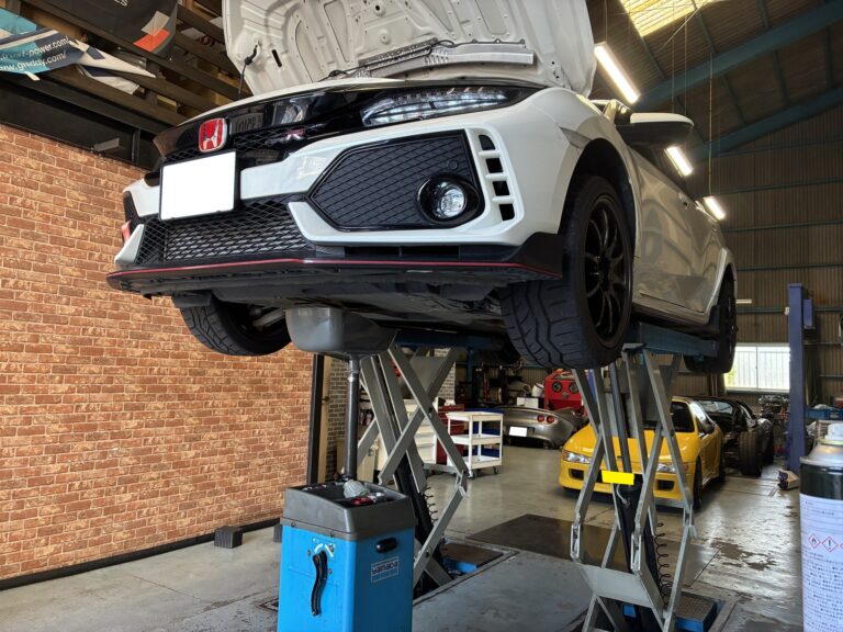 オートポリスのドライビングスクールを経て、今回本コースデビュー予定のBRZ。 本コースを走る準備として6点式シートベルトと牽引フックの取り付け。 トーイングストラップが希望とのことで、バンパー脱着ついでに軽量化と剛性アップを求め純正レインフォースをレ […]